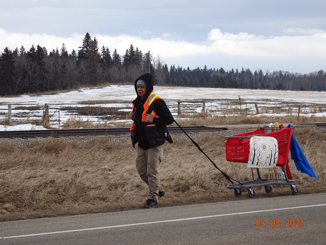 Pour dénoncer leurs conditions de vie et sensibiliser la population à la cause, Vee Point a marché de Calgary à Edmonton en traînant un chariot en solidarité avec les itinérants. Le 2 mars, Vee Point est parti à 8 h de la mairie de Calgary et a marché 40 kilomètres par jour sur l’autoroute 2A pour arriver devant la législature d’Edmonton le 9 mars.